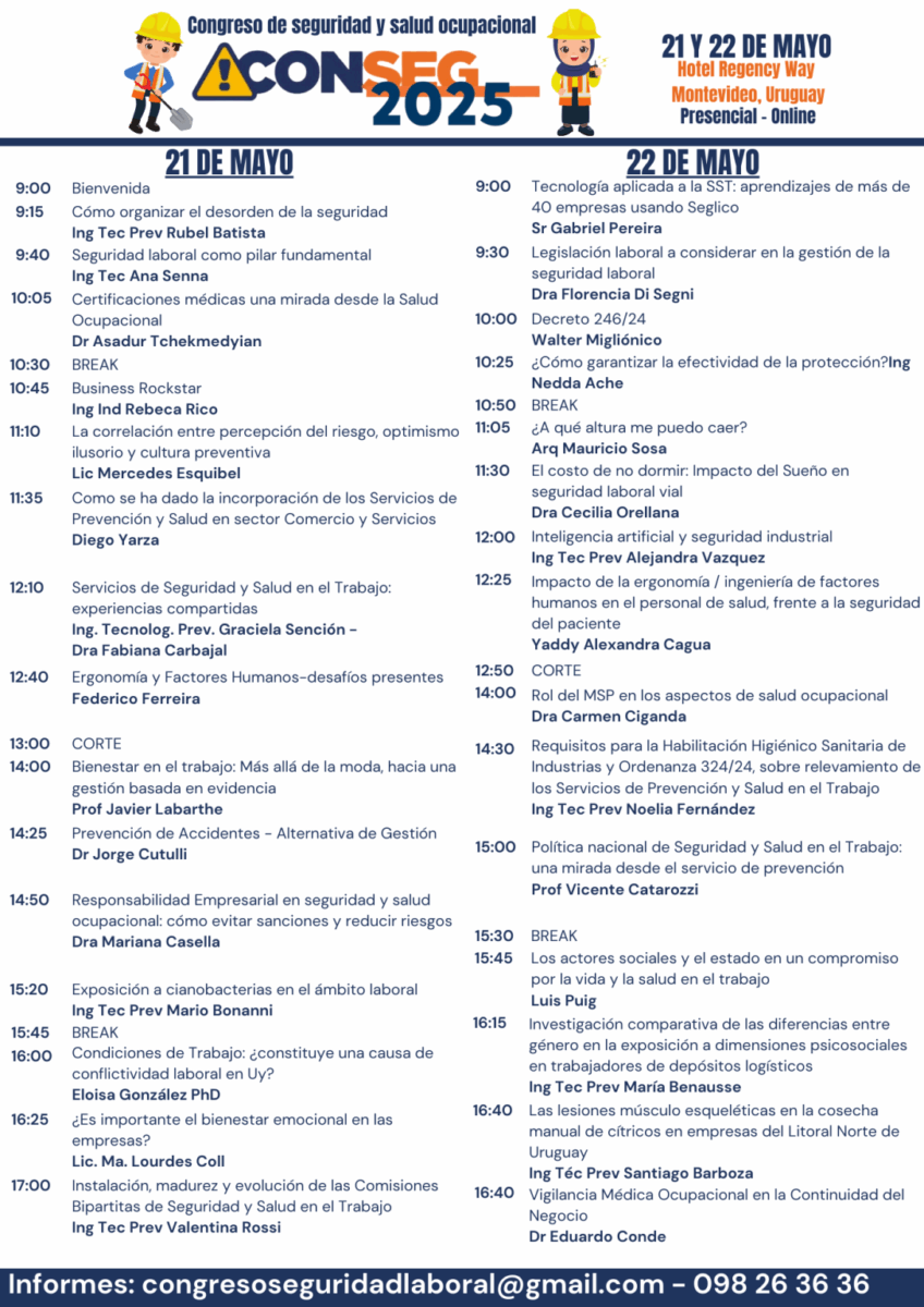 junio 22, 2025El CONSEG 2025 se llevó a cabo los días 21 y 22 de mayo de 2025 en el Hotel Regency Way, Montevideo . En representación de SUPREVU, la compañera Ingeniera Tecnológica Prevencionista Valentina Rossi expuso sobre la instalación, madurez y evolución de las comisiones bipartitas de seguridad y salud en el trabajo. La presentación destacó el marco legal nacional e internacional que da origen a estos espacios de participación, así como su papel clave en la gestión preventiva dentro de las empresas.